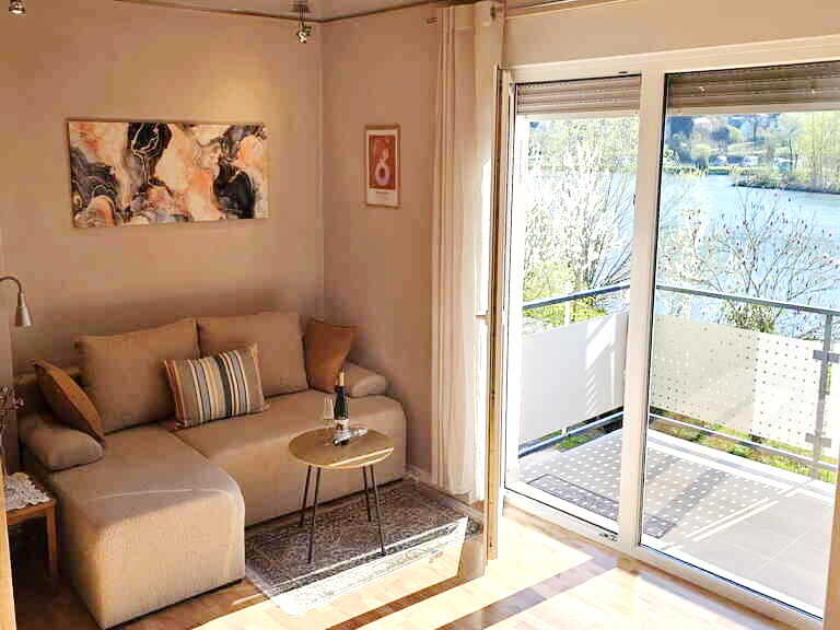 Skøn 2-værelses lejlighed i første række lige ud til Mosel, og bagved har du vinmarkerne. Den ligger i stueplan (ingen trapper) i en udlejningsejendom med tre ferieboliger kun et stenkast fra Moselfloden, og fordi grunden skråner ned mod floden, har lejligheden en balkon med flot udsigt over Mosel. Til centrum er der ca. 10 minutters spadseretur.